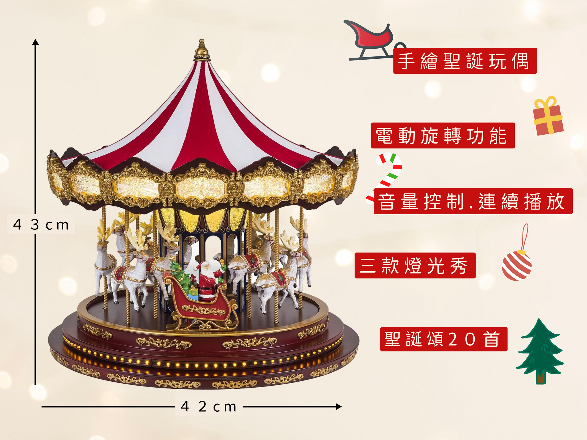 Mr. Christmas令人印象深刻的豪華聖誕旋轉木馬是他們最具代表性的商品之一,當旋轉木馬轉動時,精緻細緻的手繪聖誕老人和馴鹿會隨音樂旋轉上升下降,完美演譯歡樂的聖誕節氣氛!