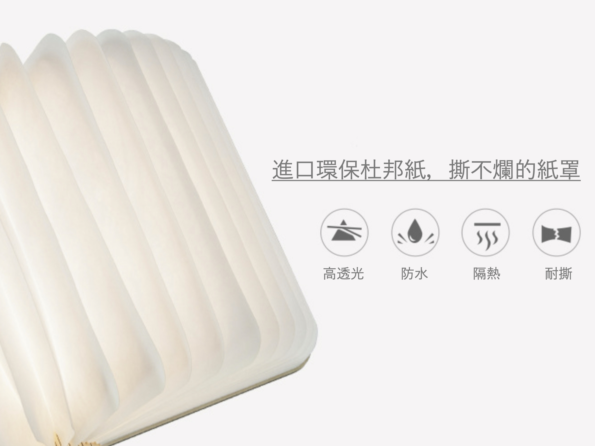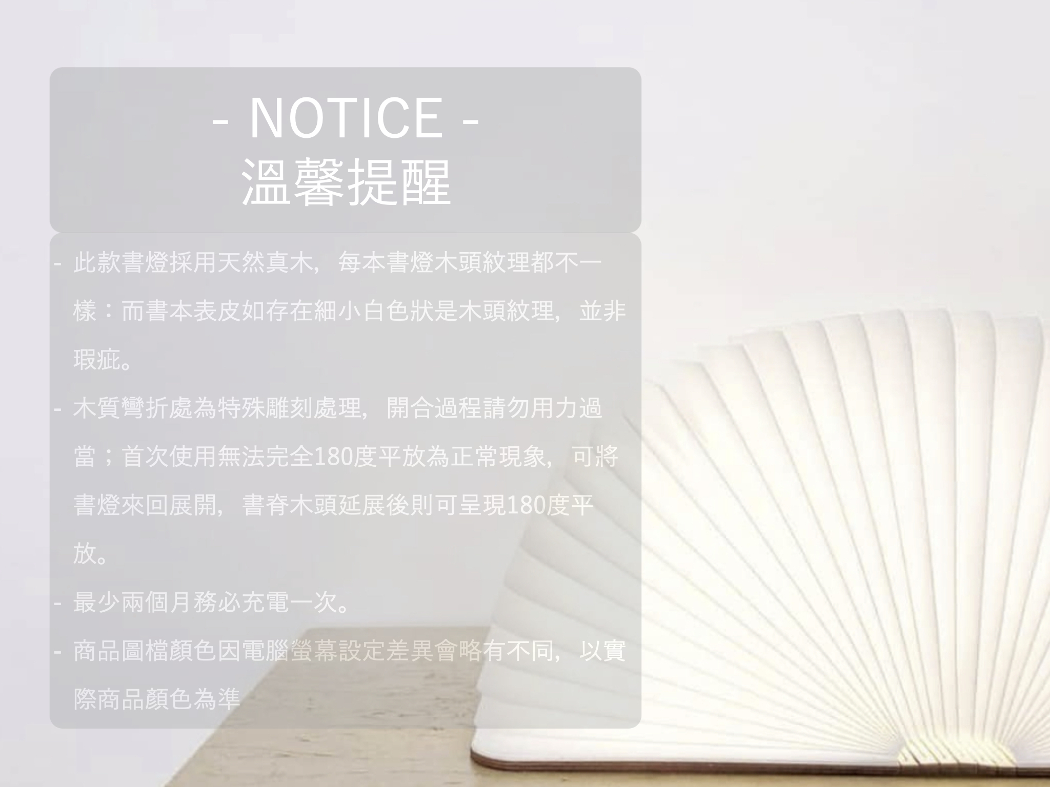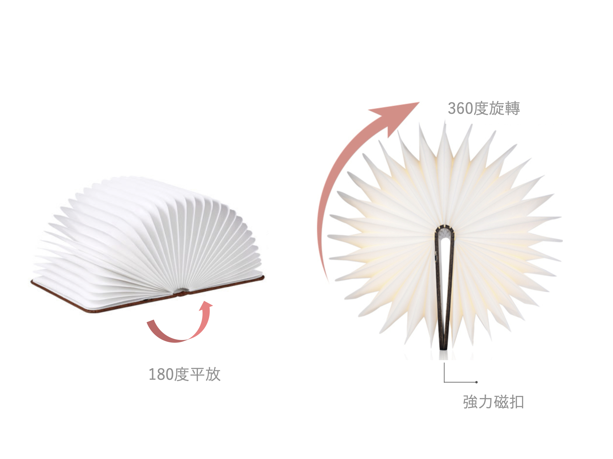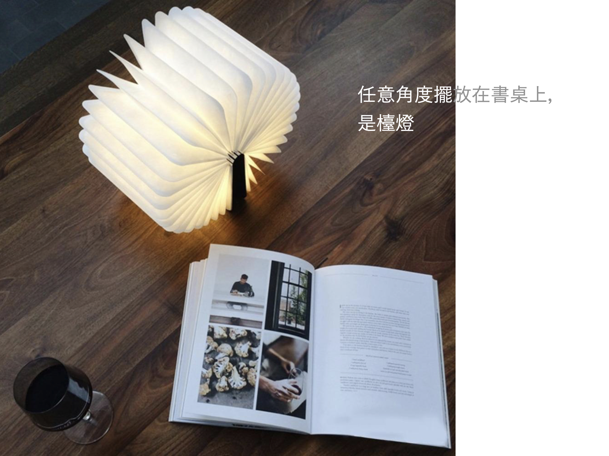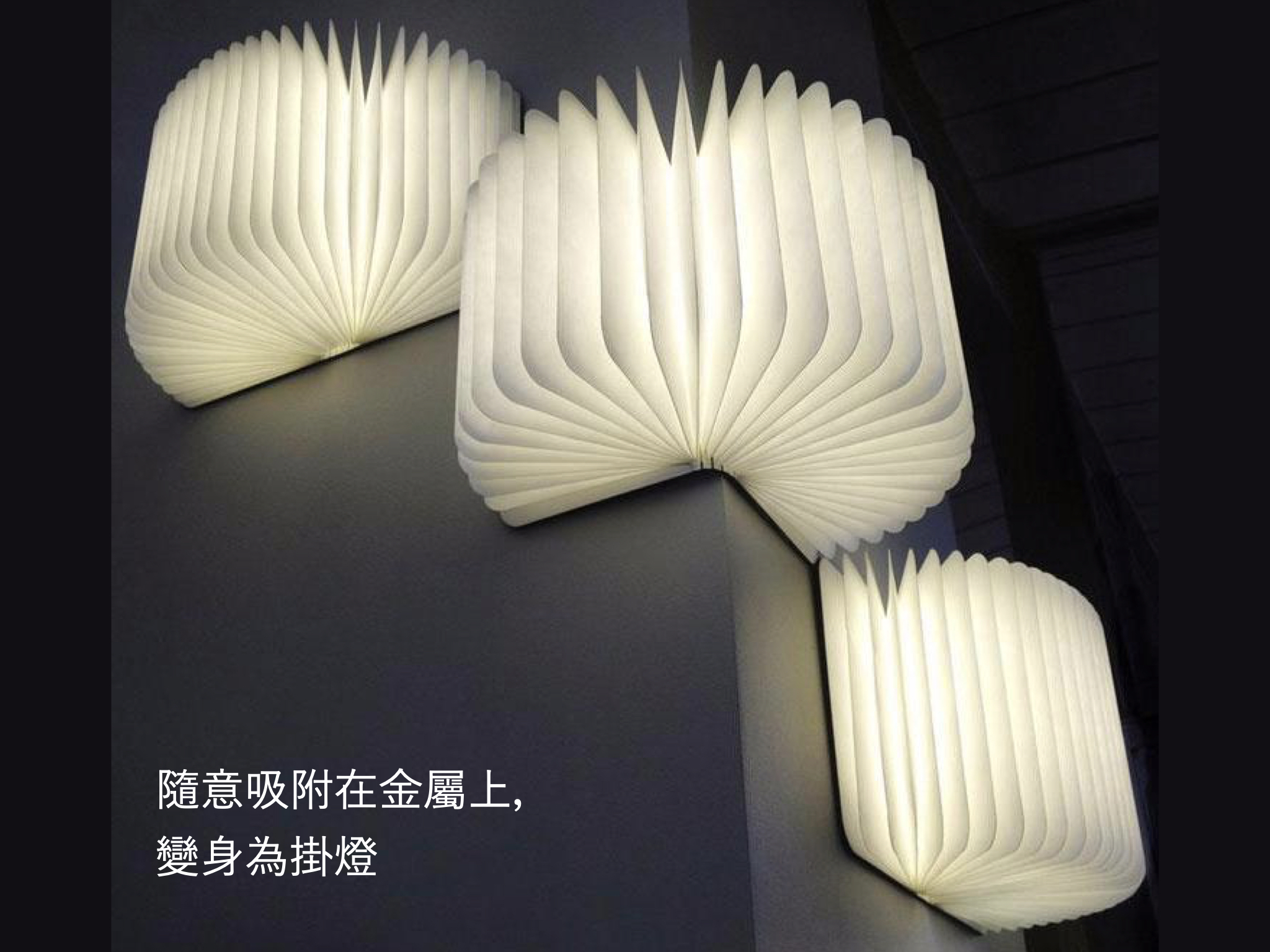 書本外殼採真木製作,具有極佳的硬度,木皮的溫潤質感,拿在手中感覺超棒!書皮內更嵌入了超強吸力的磁鐵,能夠隨意的吸附在任何磁性物品的表面,使用時,只需將它像書本一樣翻開,內置的 LED 燈便會自動發出溫暖明亮的燈光,最大幾乎能夠照亮360度的範圍,極具創意可變換成多種造型,檯燈、落地燈、吊燈等等,都能營造出愜意的創意居家氛圍。