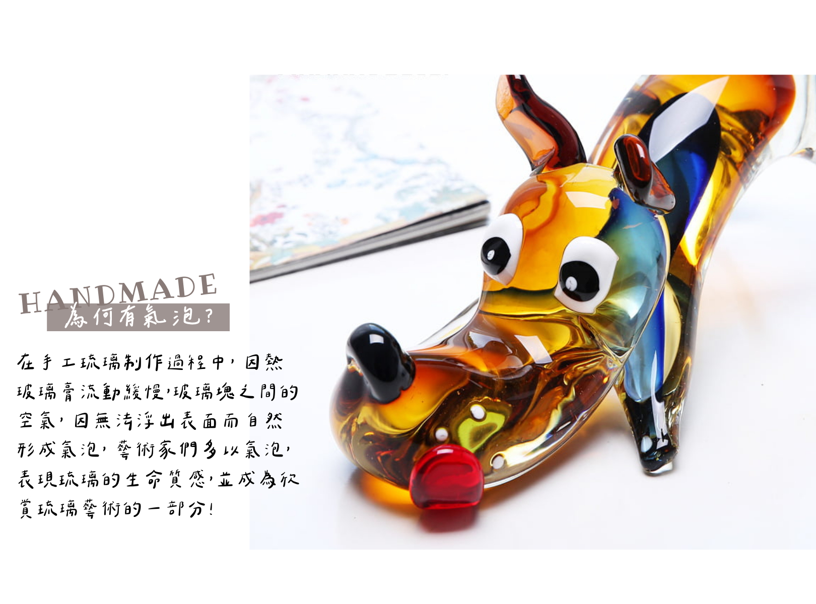 手工熔鑄出晶透琉璃,匠人打造出一隻隻俏皮生動的狗狗擺飾,以特殊工藝融入多種顏色,並經過幾十道繁複工序後完成,能在燈光下綻放出金燦燦的琥珀色,吐舌趴地的狗狗,透過螢幕也能感受到的超萌模樣融化眾人的心!