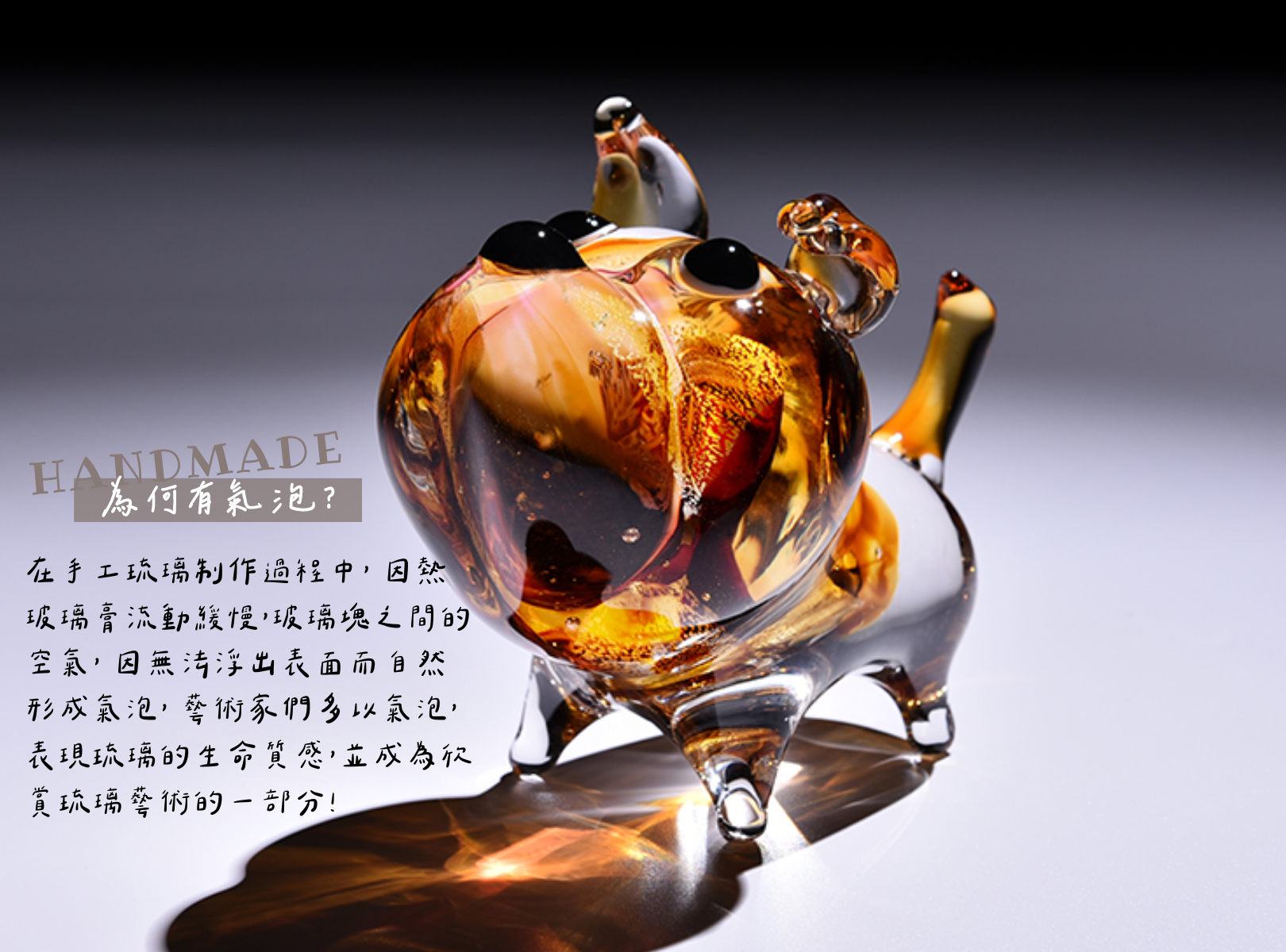 手工熔鑄出晶透琉璃,匠人打造出一隻隻俏皮生動的狗狗擺飾,以特殊工藝融入多種顏色、並加入金箔,並經過幾十道繁複工序後完成,能在燈光下綻放出金燦燦的琥珀色,沙皮大頭狗狗造型,憨直呆萌的模樣超級可愛!