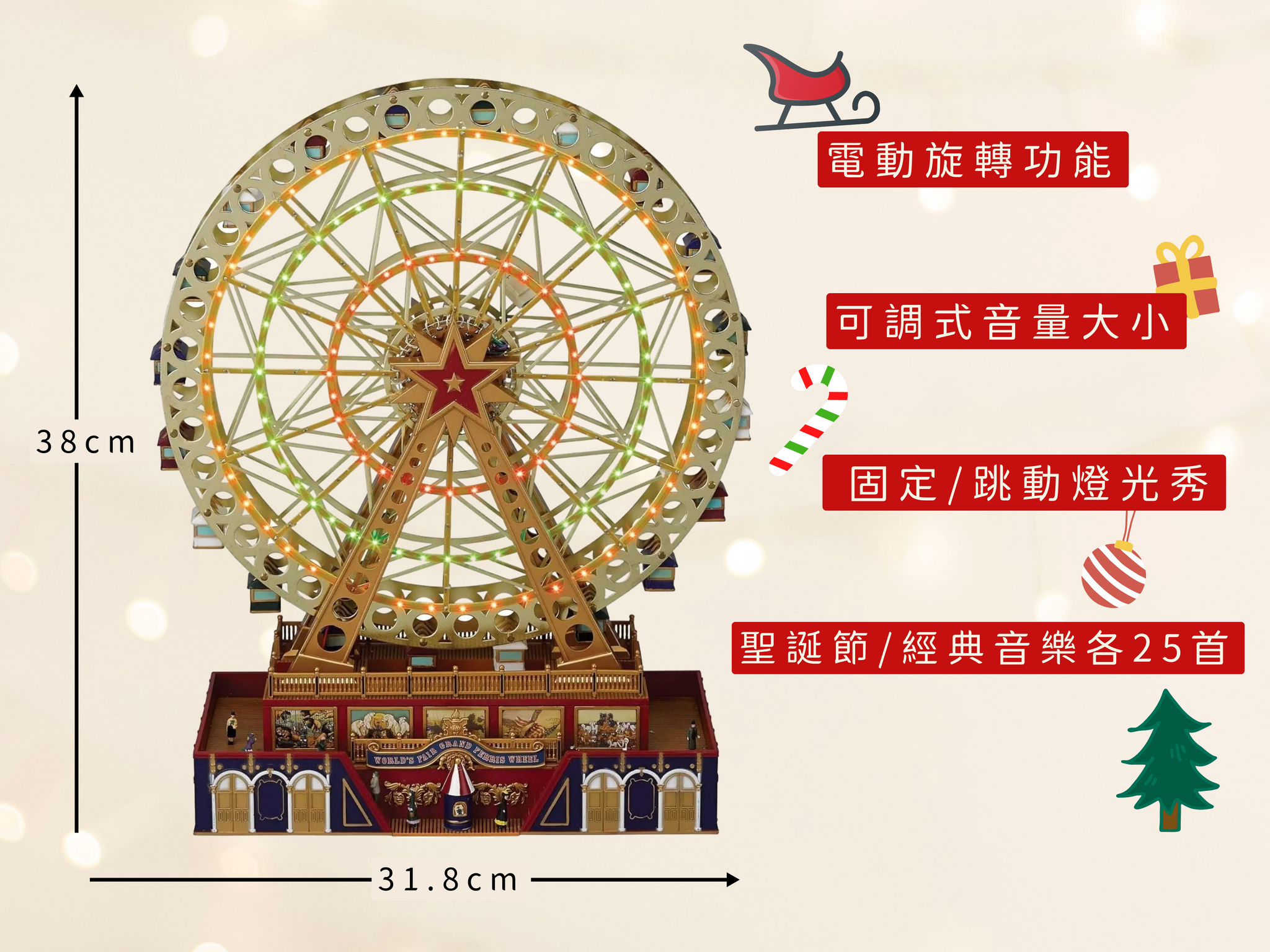 聖誕節先生的博覽會大摩天輪將遊樂園的魔力帶入您的家;這款充滿動感、燈光和音樂的摩天輪,採用真正的金屬輪和手繪細節,色彩繽紛的 LED燈,在旋轉時營造令人眼花繚亂的燈光秀,喚醒你最喜歡的童年摩天輪回憶。