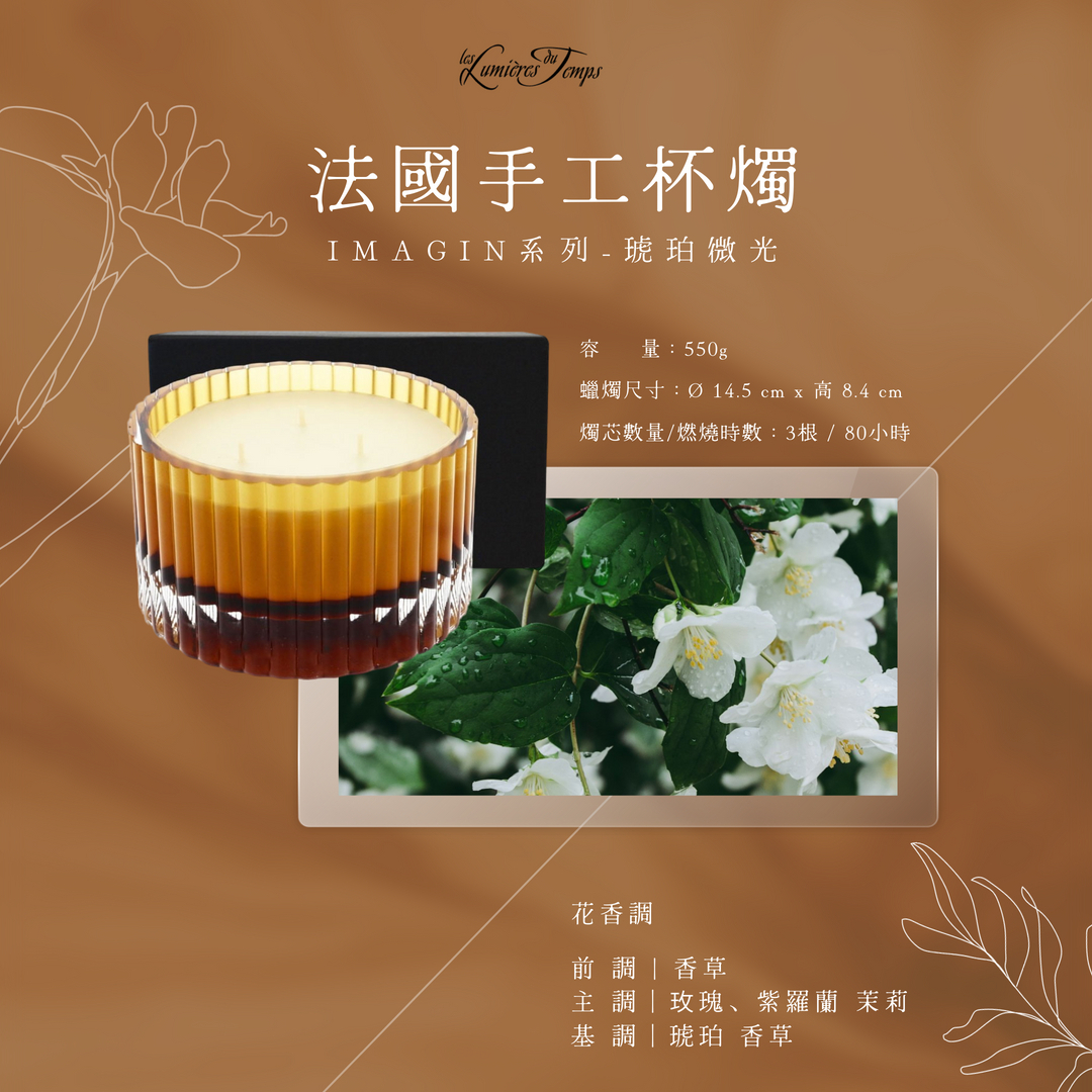 在花香與暖意交織的氛圍中,玫瑰、紫羅蘭與茉莉輕柔綻放,伴隨香草的甜美低語,逐步融入麝香與琥珀的深邃底蘊。氣息如同暮色裡的金色微光,溫潤而優雅,帶著絲絲迷人魅力,散發出柔和卻持久的氛圍。這是一款為靜謐時刻而生的香氛,既浪漫又沉穩,讓人沉醉於低調而細膩的美好之中。