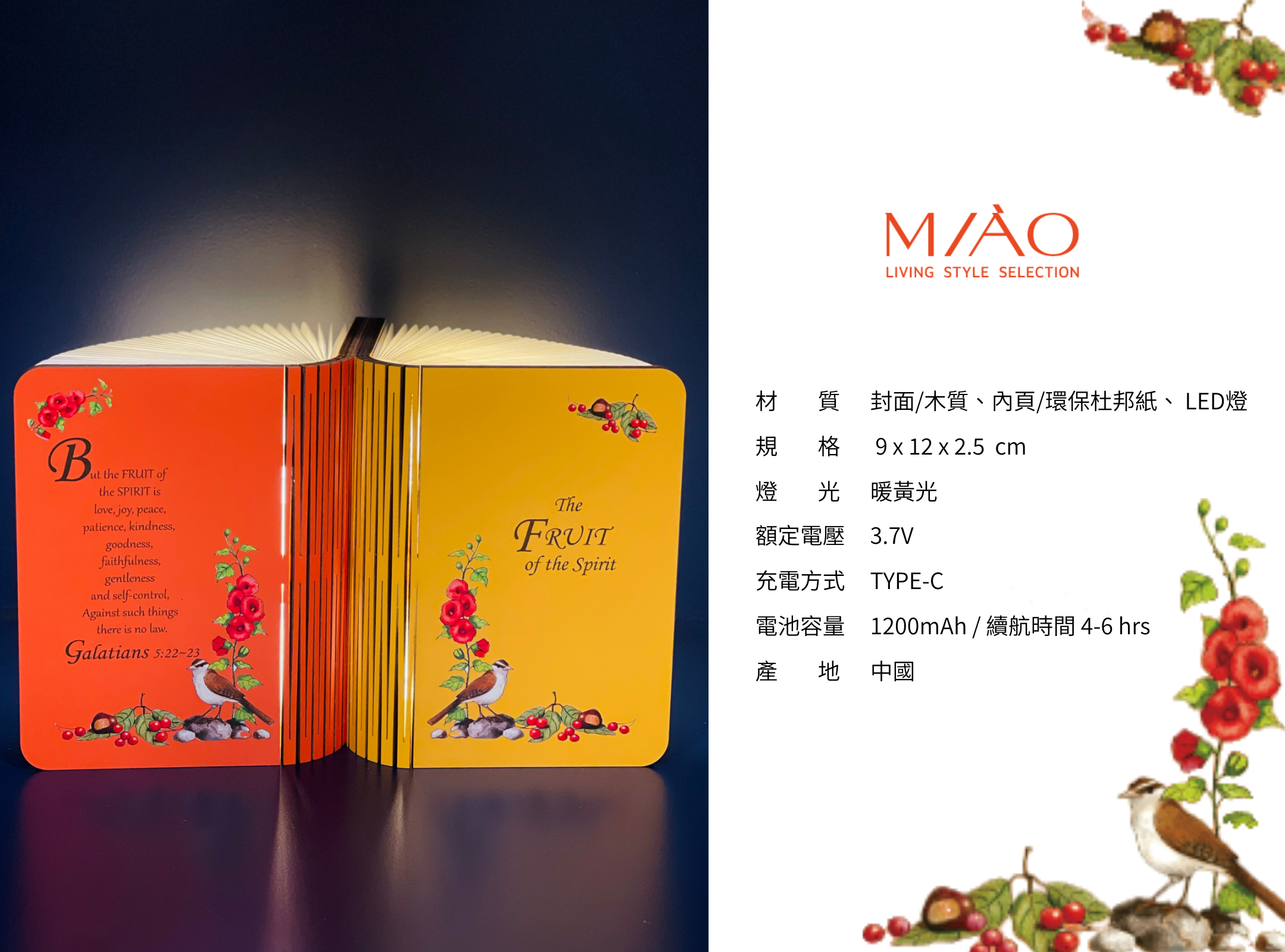 《加拉太書》中提及聖靈所結的果子就是「仁愛、喜樂、和平、忍耐、恩慈、良善、信實、溫柔、節制」九種生命果實,其2款封面顏色特別對應香蕉(溫柔)、橘子(節制)。