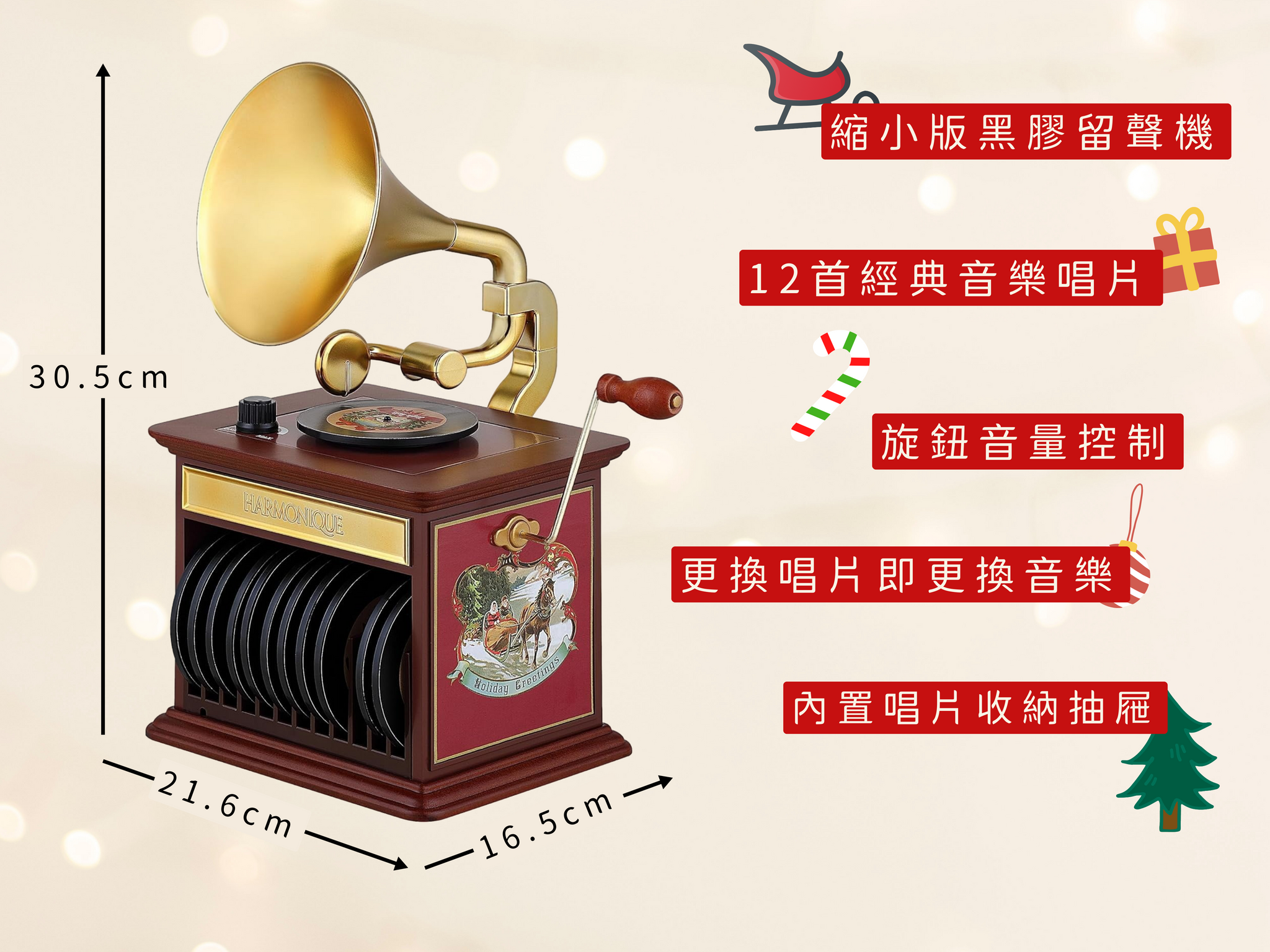 縮小版的帶黑膠唱片留聲機,附12首由經典藝人演唱的黑膠音樂,更換唱片即更換音樂,內置儲物抽屜。