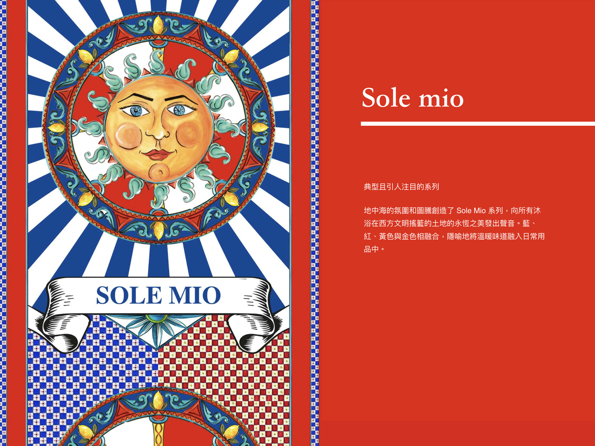 來自義大利精品家居品牌的Baci Milano,以熱情洋溢的義式風格為基底,融入對設計的激情,打造出帶著Baci意識的各系列家居商品,以地中海的氛圍和圖騰創造了 Sole Mio 系列,以藍、紅、黃色與金色相融合,隱喻地將溫暖味道融入日常用品中。