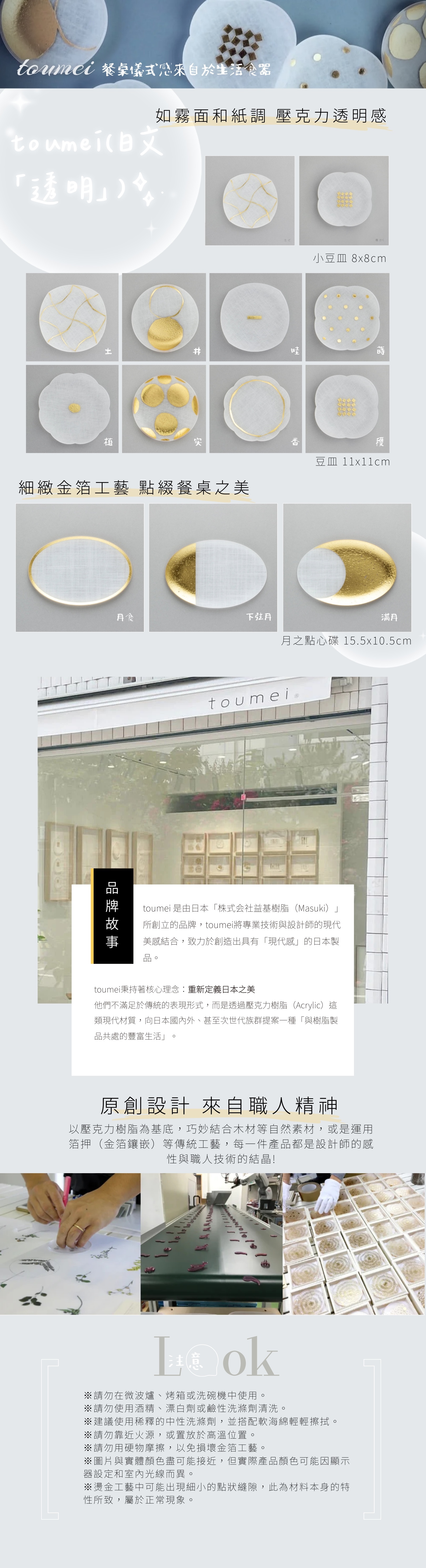 呈現和紙霧面柔和光澤感的壓克力材質,飾以燙金工藝,優雅地折射光線,為您的餐桌增添一抹亮麗的色彩。