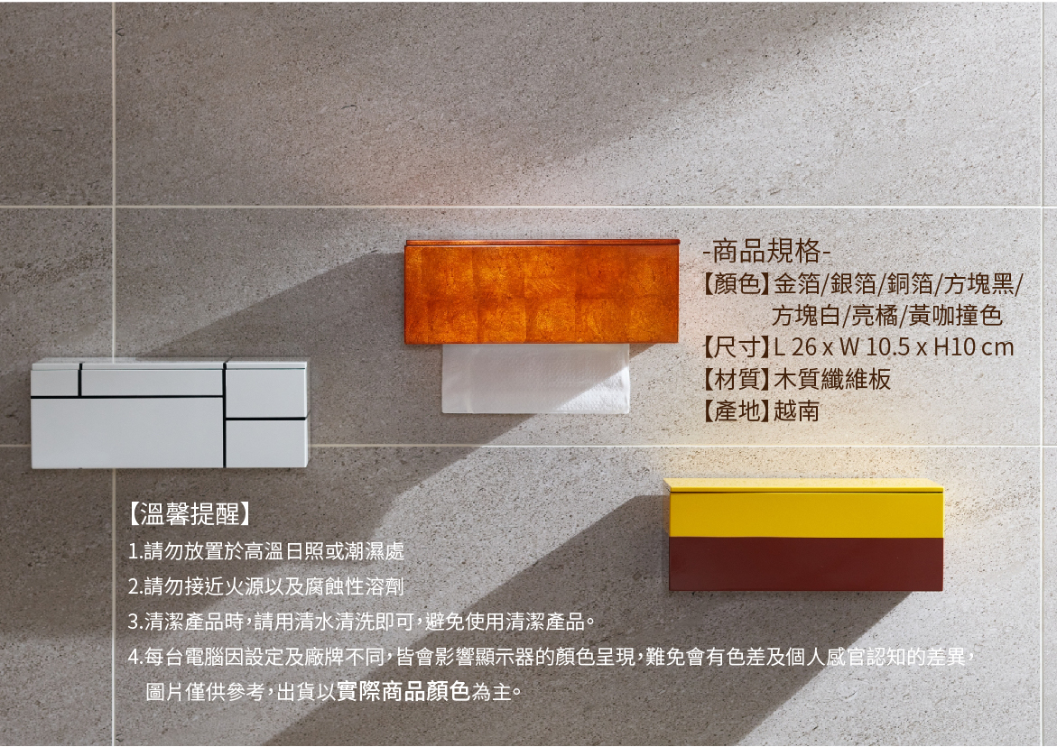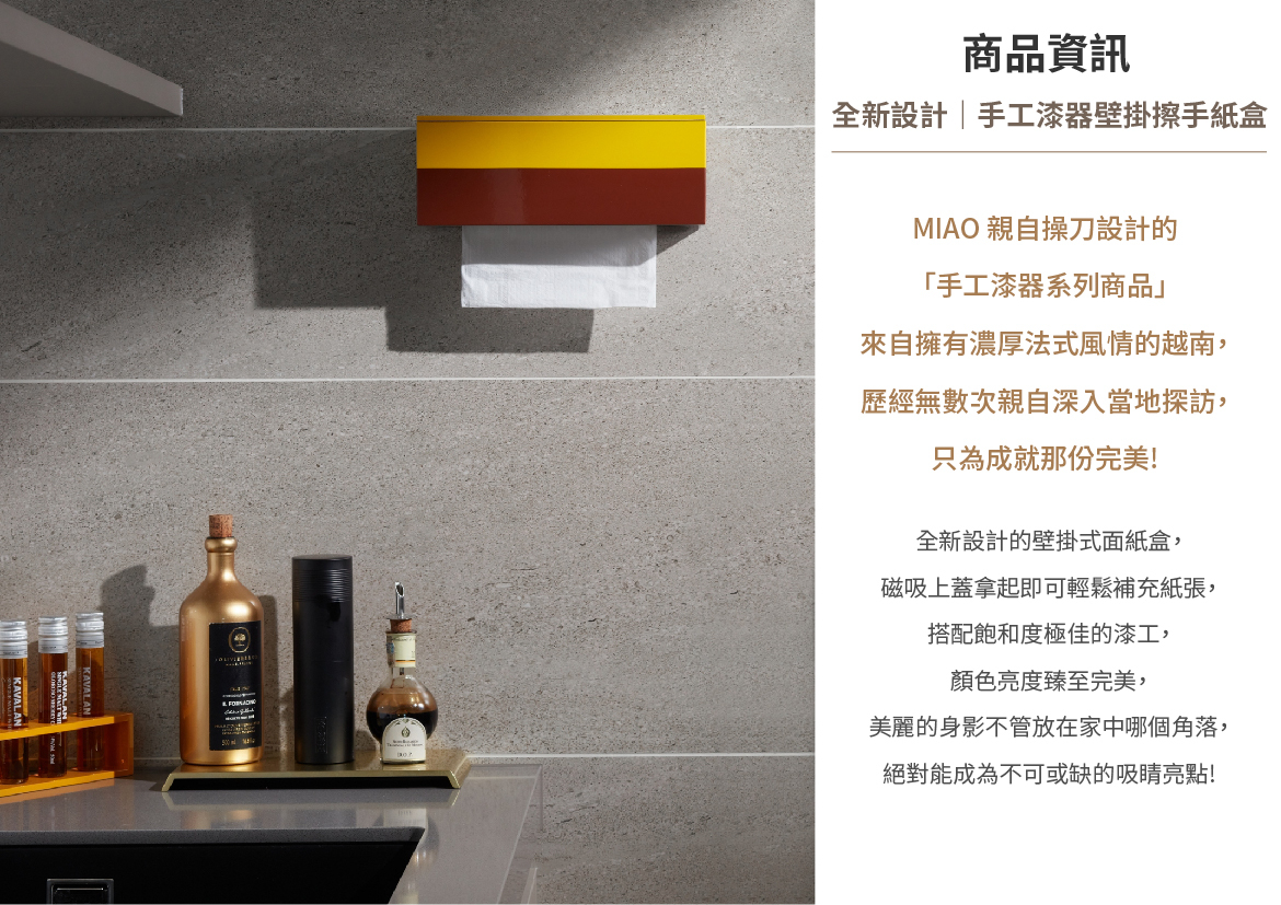 獨家設計壁掛式擦手紙盒,全手工製作的細膩漆器質感,多樣的色彩豐富您居家的每一個角落,為您的居家生活增添更多優雅風情!